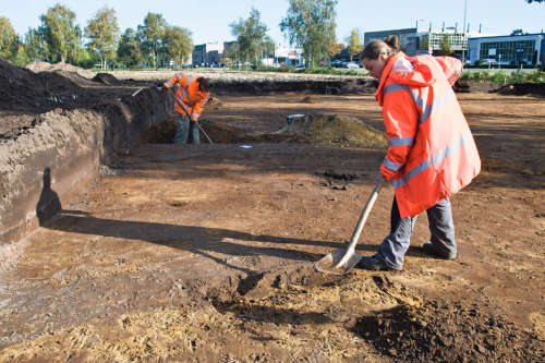 ,,Men vond toen sporen van bewoning, afkomstig uit de IJzertijd/Romeinse tijd en Middeleeuwen. Die waren aanleiding een groter stuk grond open te gooien. Daar zijn we nu mee bezig’’, vertelt projectleider Jos van der Weerden. ,,We zullen hier zo’n vier tot zes weken bezig zijn’’, verwacht hij. ,,Maar we weten natuurlijk niet of er nog verrassingen zitten.’’