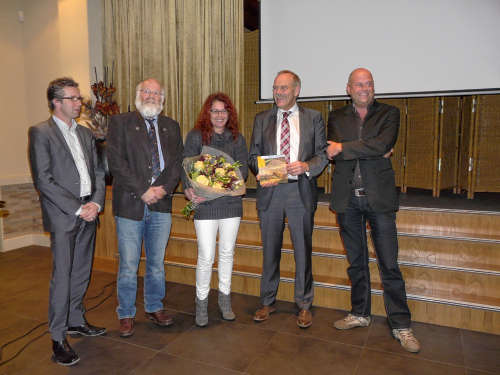 Wegens omstandigheden kon wethouder Breunis van de Weerd van Ede niet aanwezig zijn. Wethouder Roel Kremers nam de honneurs waar. Op de foto van links naar rechts gemeentearchivaris Peter van Beek, voorzitter Louis Fraanje van de Jac. Gazenbeekstichting, auteur Karen Eding, wethouder Kremers en bestuurslid Gerrit van Dijk van de Jac. Gazenbeekstichting.