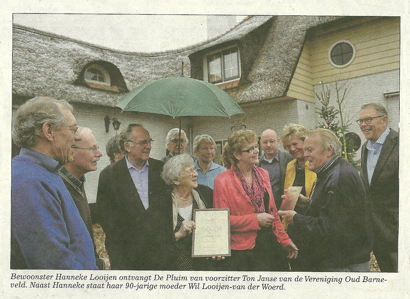 Bewoonster Hanneke Looijen heeft woensdag De Pluim 2012 ontvangen voor de instandhouding van de markante woning aan de Stationsweg 169 in Barneveld. Daarbij was ook haar 90-jarige moeder Wil Looijen-van der Woerd aanwezig.
